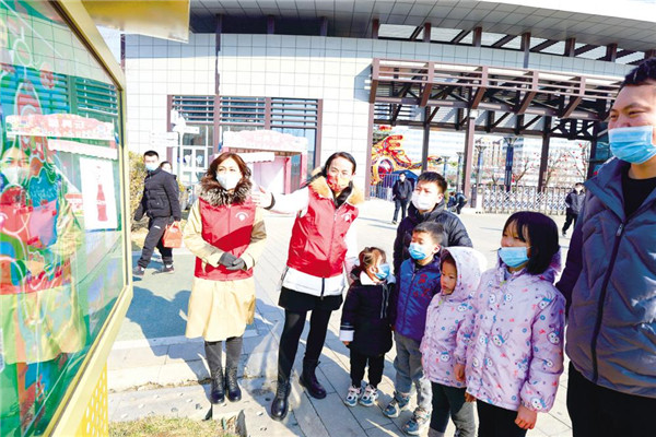 2月4日,在高新區九州洼月季公園,文明旅游志愿者正在給游客講解景區導覽圖。春節假期,聊城陽光明媚,適宜出游。在我市各景區,文明旅游志愿者熱情主動地服務游客,維護城市環境衛生,引導游客文明旅游,為春節假期旅游營造了文明和諧的氛圍,展示了良好的水城形象。文/圖 商景豪