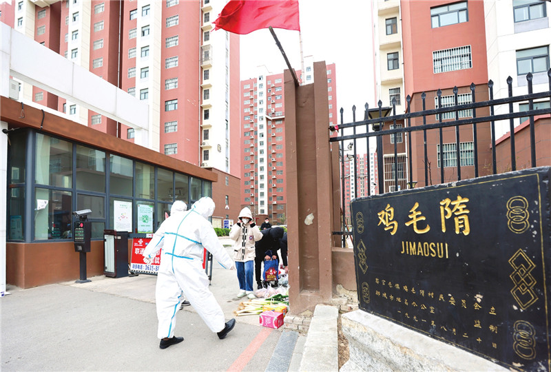 3月17日,在開發區一小區門口,工作人員幫助居民認領購買的蔬菜等生活物資。 ■ 商景豪