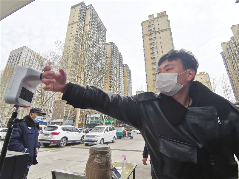 3月17日,開發區一居民小區門口,進入小區的市民在測量體溫。當前疫情形勢嚴峻,我市加大居民小區疫情防控力度,科學宣傳防護知識,引導居民堅持戴口罩、勤洗手、少聚集,做好常態化疫情防控和應急處置?!?本報記者 許金松