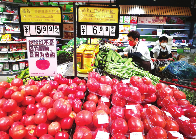 3月17日,開發區振華超市,工作人員在補充蔬菜上架。疫情期間,我市各商超貨品供應充足,價格穩定?!?本報記者  朱玉東