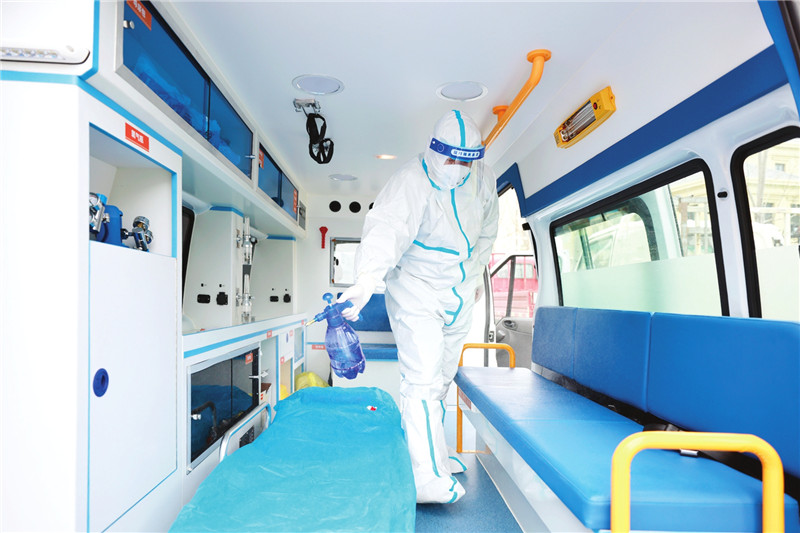3月17日,工作人員正在對救護車進行消毒,隨時準備奔赴抗疫一線。 ■ 商景豪