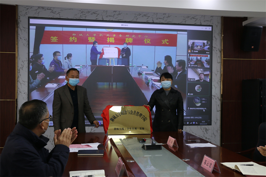 本報訊(文/圖 記者 孔祥雷)3月25日上午,聊城市機關事務管理局和聊城大學政治與公共管理學院合作共建聊城大學機關事務研究中心、聊城大學政治與公共管理學院教師實踐(學生實訓)基地簽約揭牌儀式通過視頻連線方式舉行。聊城大學黨委常委、副校長趙長林,市機關事務管理局黨組書記王廣奎、局長杜娟等參加儀式。