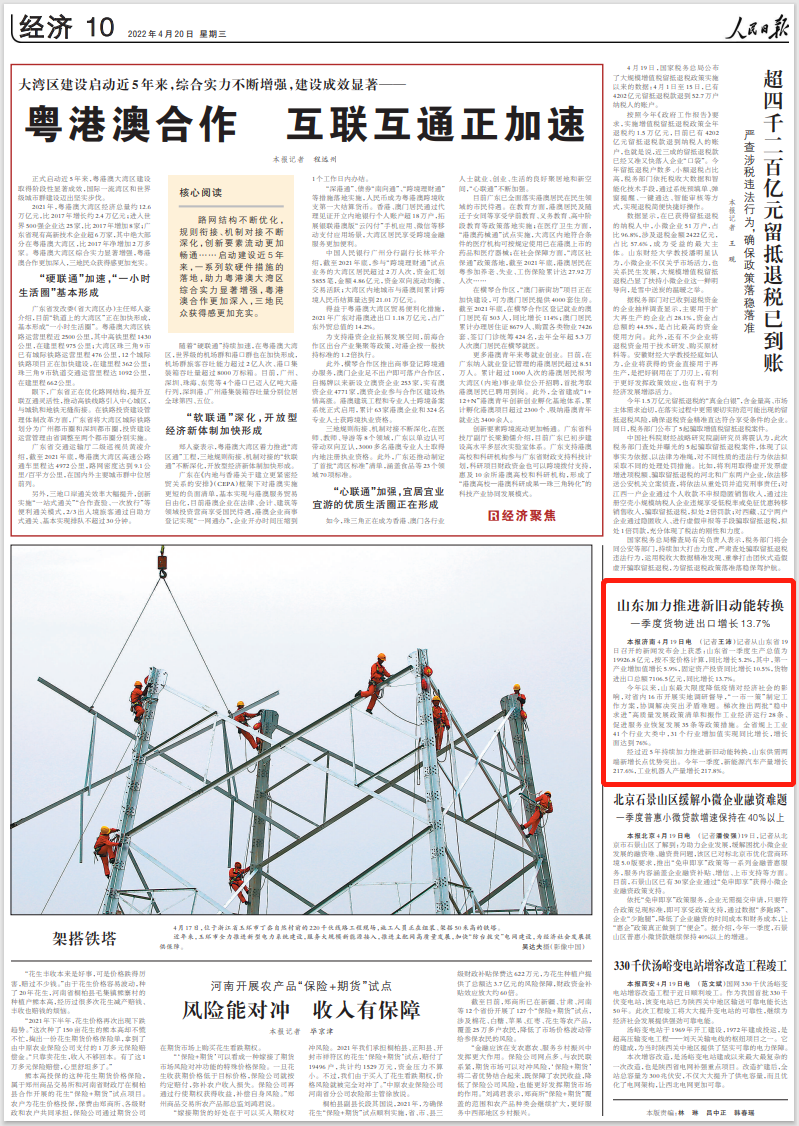 培育新動能,點燃“新引擎”。經過近五年持續加力推進新舊動能轉換,山東供需兩端新增長點優勢突出。其中,科技創新助推“卡脖子”技術相關領域迅速發展,新能源汽車增長217.6%,工業機器人增長217.8%。聚焦“雙碳”戰略,山東環保產業高速發展,光伏設備制造業增長超過200%,環境污染治理行業增長超過50%。