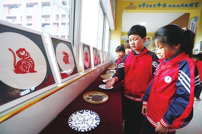 5月5日,莘縣東魯學校的學生在探討手工藝制品。 ■田柏林