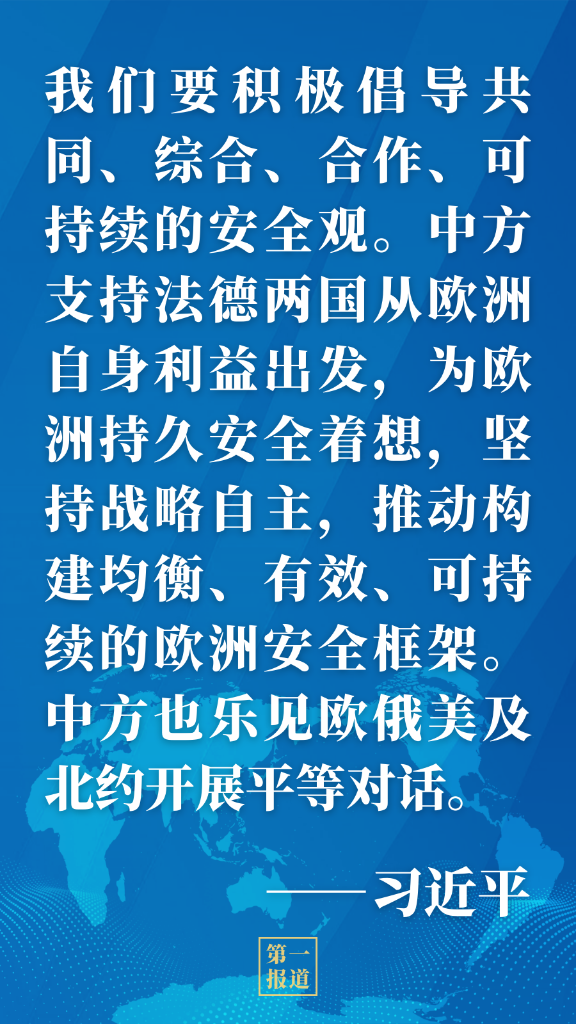 習近平強調,我們要共同支持俄烏和談,推動雙方維護談判勢頭,克服困難談下去,談出結果、談出和平。我們要呼吁保持最大限度克制,防止出現大規模人道主義危機。中方提出了關于烏克蘭人道主義局勢的六點倡議,愿向烏克蘭進一步提供人道主義物資援助。我們要一起努力減少危機造成的負面影響。有關制裁對全球金融、能源、交通、供應鏈穩定都會造成沖擊,拖累疫情下負重前行的世界經濟,對各方都不利。我們要積極倡導共同、綜合、合作、可持續的安全觀。中方支持法德兩國從歐洲自身利益出發,為歐洲持久安全著想,堅持戰略自主,推動構建均衡、有效、可持續的歐洲安全框架。中方也樂見歐俄美及北約開展平等對話。