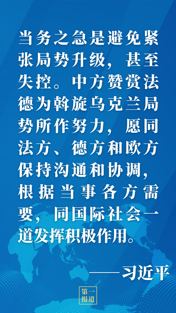 習近平強調,當前,烏克蘭局勢令人擔憂,中方對歐洲大陸重燃戰火深感痛惜。中方主張,各國主權、領土完整都應該得到尊重,聯合國憲章宗旨和原則都應該得到遵守,各國合理安全關切都應該得到重視,一切有利于和平解決危機的努力都應該得到支持。當務之急是避免緊張局勢升級,甚至失控。中方贊賞法德為斡旋烏克蘭局勢所作努力,愿同法方、德方和歐方保持溝通和協調,根據當事各方需要,同國際社會一道發揮積極作用。